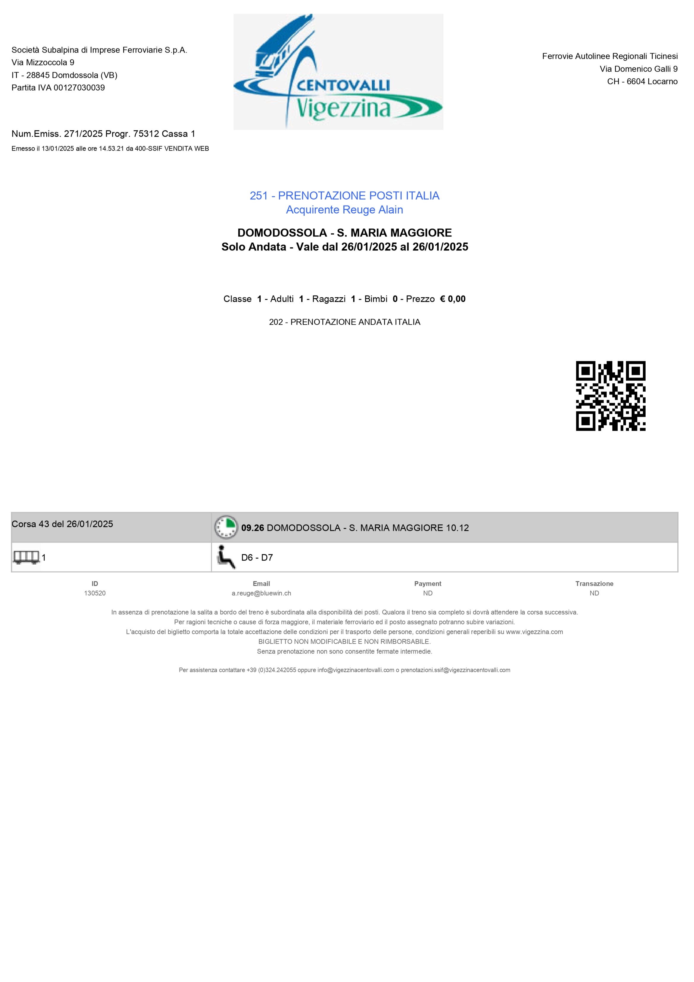 La Società Subalpina Imprese Ferroviarie (SSIF) exploite la partie italienne de la ligne dite Vigezzina longue de 52 Km reliant Domodossola à Locarno. La partie suisse dite des Centovalli est exploitée par Ferrovie autolinee regionali ticinesi (FART). Chaque compagnie exploite, et publie les horaires, les trains régionaux sur son territoire. Les trains internationaux sont exploités sous la marque Ferrovie Vigezzina-Centovalli